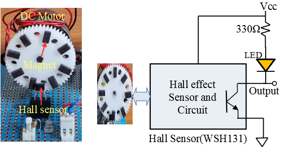 Motor speed detector 회로 예(LED는 Hall sensor의 동작을 확인하기 위한 것임. LED를 사용하지 않는 경우에는 LED를 제거하고 330Ω 저항을 VCC에 따라 2K - 5K 사이의 저항으로 변경한다.)